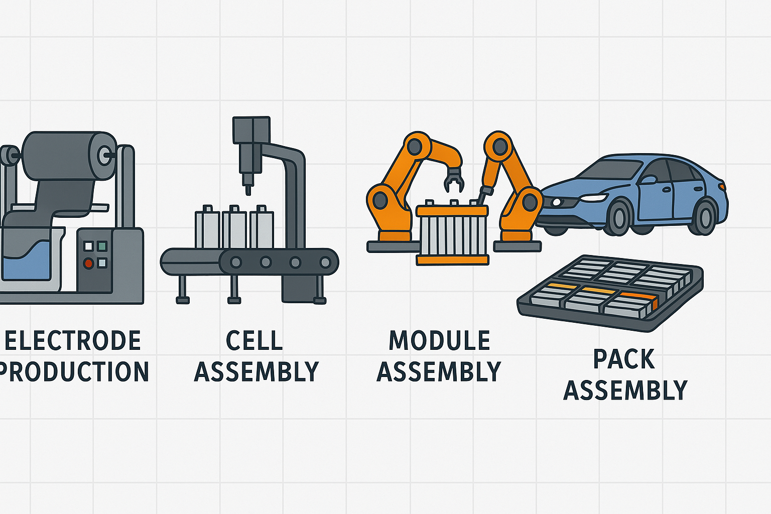 배터리팩은 크게 배터리 셀 생산, 모듈 조립, 배터리팩 조립의 단계를 거쳐 완성됩니다.