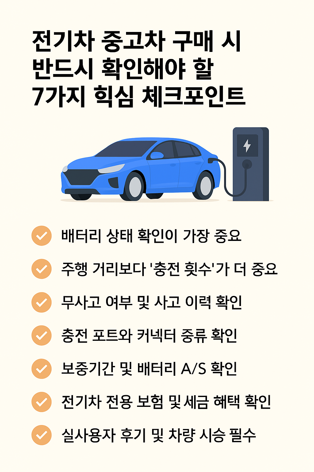 전기차 중고차를 살 땐 배터리 상태와 충전 이력, 보증 기간을 꼭 확인하세요. 주행거리보다 중요한 건 충전 횟수와 하부 사고 여부입니다. 충전 방식이 호환되는지, 정부 혜택이 남아 있는지도 체크해야 합니다. 꼼꼼하게 비교하고 똑똑하게 구매하세요!